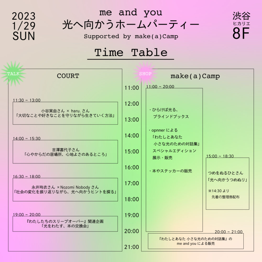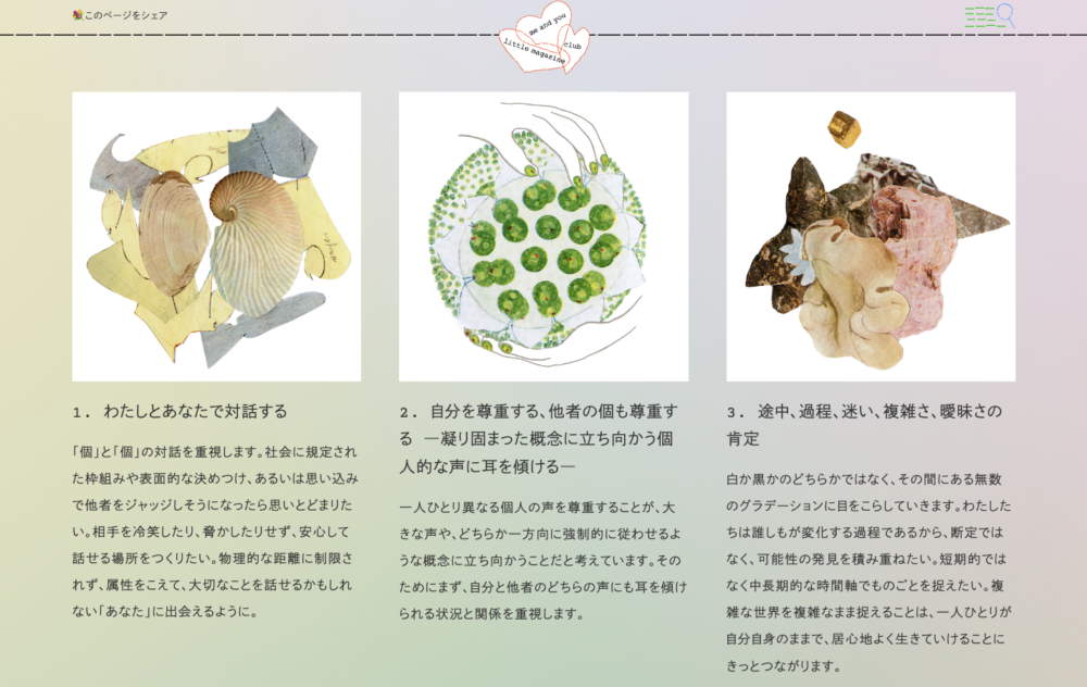 me and youは、他者や自分自身を尊重する仲間と手をとり合い、関わる人々との対話を重んじながら、個人と社会の結びつきをひとりひとりが安心できる形にときほぐし、ゆるやかに結び直すためのプロジェクトを生み出していきます。個人の小さな声や温度を大切にしたまま、社会に存在する課題に向き合うこと。ものごとの「あわい」や「振幅」に目を配り、一つの選択肢で塗りつぶさないこと。心強い仲間とのつながりと、当たり前とされているものを問い直す編集視点を軸に、学びを心がけ変化を受け入れながら活動していきます。