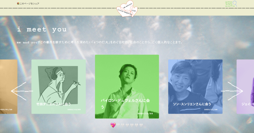 me and youは個人と個人の対話を出発点に、遠くの誰かにまで想像や語りを広げるための拠点です。当たり前とされているものを問い直す編集視点を軸に、メディア・コミュニティの運営や、社会が抱える課題について企業や団体とともに考えるプロジェクトに取り組んでいます。
